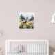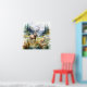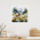 Two deer in mountain landscape with trees and flowers