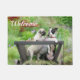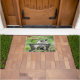 Two cute dogs, a black masked fawn pug puppy and a young Boston Terrier, black with white markings, posing side by side and talking together in an old wooden cart in a garden. A cute doggy photo taken by Katho Menden. This photo printing door mat welcome is a gift idea for dog lovers. Personalize it with your name or text.