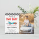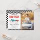 Cute race car theme kid's 2nd birthday party photo invitation card featuring illustration of a blue vintage car with flames. The text says "growing up two fast."