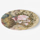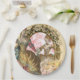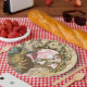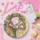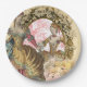 Combination of vintage French Rococo style images including two women in clothing style reminiscent of Marie Antoinette. Complicated and tall hair styles. Low cut dresses with tight waists in gold, pale blue and rose red. The first woman is at the left foreground and the 2nd is through a flowered oval frame. A pink French wallpaper pattern is seen at the far back.