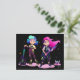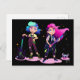 Two girls musicians play rock guitars together. They smile and feel cheerful. Blue is wearing stylish pants in a cage and punk style suspenders with a Mickey Mouse T-shirt. Red is wearing a stylish and bright outfit that emphasises her personality. The illustration is bright and joyful with a wonderful characters full of harmony and happiness. They make a wonderful musical duo.
