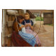 This design features a painting by the Danish artist Hans Andersen Brendekilde (1857–1942). It depicts two girls doing needlework, either crocheting or knitting fabrics. They are sitting together on a small wooden bench in a farmyard in rural Denmark. There is a small cat in the background. Further back there appears to be a woman sowing seeds or picking vegetables. The original artwork was painted by H.A. Brendekilde in 1902.