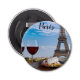 Two glasses of red wine with snacks with view of Paris and Eiffel tower. Glass of red wine with different snacks - plate with ham, sliced, blue cheese. Couple, romantic celebration