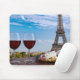 Two glasses of red wine with snacks with view of Paris and Eiffel tower. Glass of red wine with different snacks - plate with ham, sliced, blue cheese. Couple, romantic celebration. Cafe with view
