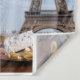 Two glasses of red wine with snacks with view of Paris and Eiffel tower. Glass of red wine with different snacks - plate with ham, sliced, blue cheese. Couple, romantic celebration. Cafe with view