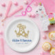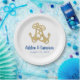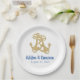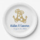 Nautical wedding paper plates for a shower or casual reception. White plates with two gold anchors and blue text. Shipboard ceremony, or cruise wedding needs can be found in the anchor collection of stationery and party goods.