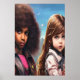 Two best friends outside a summer day, a young brown girl with brown curly hair and a young child girl with long brown hair. This is a AI generated art.