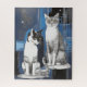 Puzzle in an illustration of two cats sit gracefully against a deep blue, abstract background. The realistic fur textures with bold linework and geometric elements, creates a modern, surreal atmosphere. Their expressive yellow eyes contrast strikingly with the cool-toned surroundings.
