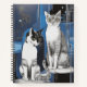 Journal in an illustration of two cats sit gracefully against a deep blue, abstract background. The realistic fur textures with bold linework and geometric elements, creates a modern, surreal atmosphere. Their expressive yellow eyes contrast strikingly with the cool-toned surroundings.