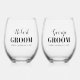 Two groom's names black typography wedding set of two Stemless Wine Glasses. Get ready to toast in style with this elegant wedding set of two Stemless Wine Glasses! The black typography design adds a touch of sophistication to your special day. The glasses showcase the names of the grooms in script typography. The words 'GROOMS' are written in a bold font.