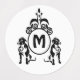 Two black stenciled guard dogs sitting around around a customisable monogram. The monogram frame is done in a decorative french iron style.
