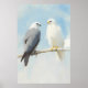 A detailed painting of two hawks perched on a thin branch with a soft, clear blue sky in the background. One hawk is grey with dark accents, while the other is bright white with golden talons, creating a striking contrast. The textured brushstrokes give the artwork a gentle and natural feel, perfect for capturing the beauty of birds in their natural habitat.