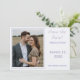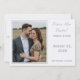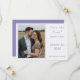 Design features the photo you provide as main design displayed against an off-white background and framed by an elegant, periwinkle/purple-colored border. To the right of photo, your text containing heading, names and city & state of wedding are displayed in a matching periwinkle font.