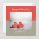 Modern artistic valentine features red / grey colorblock background with centre pic of two red wood hearts and bokeh background,  happy valentine's day in white modern script with customisable script at bottom to add your own personal touch.