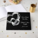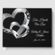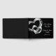 This wedding guest book is shown in a black color with a two hearts one love theme print shown with silver tone hearts with crystals and has white colored text.