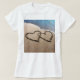 Beautiful, professional, original photo of two hearts written or drawn in the sand along the blue ocean water to signify love and romance and put on a t shirt. Great concept for upcoming summer weddings. Nice keepsake gift for the bridal party and wedding guests too.