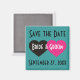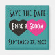 This Save the Date refrigerator magnet features two hearts overlaid by template text for the names of the bride and groom. The words "save the date" appear above the hearts, and the date appears below.