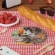 Two husky dogs, a garden cart and pumpkins paper plate