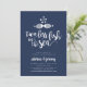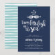 Our coastal chic summer engagement party invitations feature a kissing pair of fish in white on a nautical navy blue background. "Two less fish in the sea" appears in brush calligraphy lettering, with your engagement party details beneath. Invitations reverse to hand drawn stripes in aqua and white.