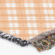 "Two images of an orange and white checkered blanket with fringe edges, shown horizontally and vertically. The design conveys warmth and coziness."