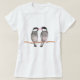 A watercolor drawing of two Java sparrows. They sit next to each other on a long stick and touch each other with the tips of their beaks.