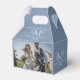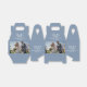 Wedding favour box design with two photos of newlyweds, blue-grey background colour with customisable white botanical flowers embellishments monogram—personalizable names and date.