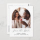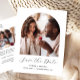 This simple, minimalist boho Save the Date postcard features an arch-shaped photo above the words "Save the Date" in elegant black handwriting script, followed by the couple's names, wedding date and city in sans serif font on a white background. Add a second, rectangular horizontal photo  on the back, along with your return address and additional text with more information or details.