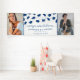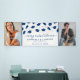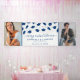 Modern joint graduation party banner featuring a simple white background that can be changed to any colour, 2 photos of the graduates, falling blue mortarboard caps, and a modern text template that is easy to personalise.