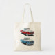 A couple of pickup trucks together. One red and one blue. This design looks really effective on this Tote Bag