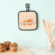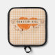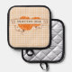 This pot holder design features two pumpkins and a place to add a name. There is a light orange gingham patterned background.