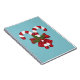 Destei's original illustration of two red and white striped Christmas candy cane treats decorated with a red bow and a Christmas holly / Common holly plant. The background colour is blue.