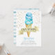 Cute ice cream theme twin boy's birthday party invitation card featuring watercolor illustration of blue ice creams on waffle cone. There are faux gold sprinkles around. The text in the banner says "two scoops are better than one." Perfect for a boy's birthday in the summer.