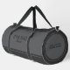 Sleek and monochromatic gym duffel bag design with customizable sports typography in dark gray against a medium gray background. Accented with stripes for a stylish touch.
