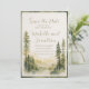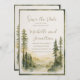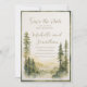 Christian wedding Save the Date card with inspirational quote scripture depicts a beautiful framed simple nature watercolor design including forest pine trees and mountains in earth tone shades of sage, dark green and tan. It features Bible Verse introduction, "And the Two shall become One."