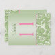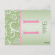 This double-sided sage green and pink floral damask table number postcard matches the wedding invitation and other items shown below. **You must change the number 11 to each of the table numbers you need, add it to your cart, and then return and repeat the process until you have all the individually numbered cards that you need in your cart. Stand it on a small easel, or in your centerpieces. If you need assistance, email niteowlstudio@gmail.com.