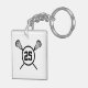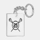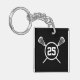 Custom lacrosse number keychain. Black and white, personalised lacrosse player number keychain. White design on black background on one side, reverse black design on white background on the other side. Circle and crossed lacrosse sticks frame with your individualised player number inside.