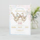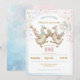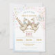 A charming watercolor birthday invitation featuring two dancing geese celebrating twins. The female goose wears a dusty pink crown and bow and holds a bouquet of pink and blue balloons with soft roses, while the male goose wears a blue crown and bow and blows a trumpet bursting joyful confetti. Rendered in soft pastel watercolor with abstract pink and blue background washes, this design creates a sweet vintage nursery mood perfect for a boy-and-girl twins' birthday celebration.