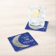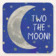 Party coasters with a Two The Moon theme for second birthday parties. The grey crescent moon is on a dark blue night sky background with silver and gold stars.