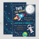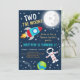 This cute invitation features an astronaut, rocket ship, moon and star background.