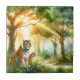 A serene forest bathes in the gentle glow of sunlight, creating a peaceful day. Amidst the lush greenery, tigers with a brave look in their eyes, embodying the wild beauty and strength of nature. The vibrant colours of the trees and the warm sunlight enhance the natural splendour of the scene, making it a captivating depiction of the forest's tranquil yet powerful essence.