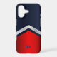 This bold and colorful two tone phone case pairs dark navy blue with red and a silver V shaped stripe. Your monogram is in matching navy blue script at the bottom. Modern and classy for either a man or a woman.