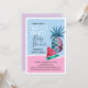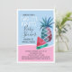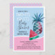 This baby shower invitation is designed for the couple who is having twins - a boy and a girl. The background is half pink and half blue and is accented with pieces of fruit.