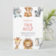 Cute and fun kid's safari animals theme 2nd birthday party invitation featuring illustration of safari animals of giraffe, snow leopard, rhino, lion, elephant, and zebra. The text says "XX is TWO wild." Perfect for a boy's birthday party.