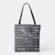 Charcoal grey tote bag printed all-over with names of traditional Italian pizzeria restaurant pizza names. Ideal gift for pizza restaurant employees!