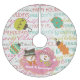 Typography and Snowmen personalised holiday tree skirt features a vintage look white background with typography text, ornaments, snowflakes, and a cute snowman couple in top hat and winter knit hat and scarves on a pink and orange banner with an area you can easily personalise with your names or family name! This fun and colourful Typography and Snowmen design holiday tree skirt makes a great gift or get one for yourself to enjoy for years to come!