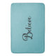 Hand written font in black with the word "Believe" on a robin egg blue bathroom floor mat. Other products with this design are available rom Farmhouse Living.