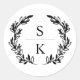 Elegant wedding envelope seal with a laurel wreath monogram. Monogrammed envelope seal with a black laurel wreath against a white background.