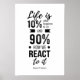 This is a beautiful motivational quote poster featuring Life is 10% what happens to us and 90% how we react to it by Dennis P. Kimbro in white.