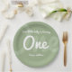 Our little baby is turning one first baby birthday round paper plates. These plates are sage, green, with white. The word "One" is in large letters in a cute typography style with a modern and minimal design. Simply, customise these plates, add them to your cart, and happy birthday to your wonderful baby!