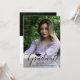 Photo on front and back... Carefree script graduation invitation announcement with mortarboard graduation cap icon, perfect for the high school or college grad. Modern minimalist typography, casual elegant script "Graduate" writing. Capture those special moments of growth and smiles of joy and youthfulness for all time. Upload a full portrait-mode cover photo of the graduate on front, and a landscape orientation photo als well as pertinent details of the graduation party on back. Automatically shades the perfect areas of the pic.